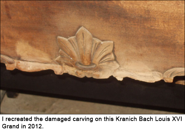 Zar oilbase stain, and satin polyurethane to create a lovely smooth “open-pore” look, especially uprights. One of my specialties is recreating complex carving that has been damaged by the years and too many sloppy movers. [see adjacent photos]