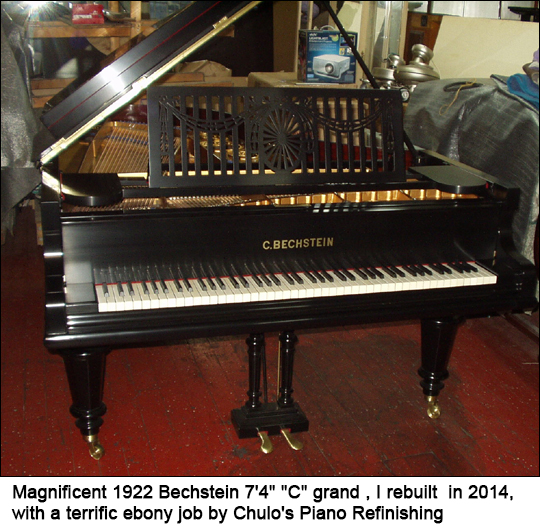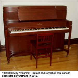 However, I do subcontract any “ebonized” black lacquer pianos to my excellent refinisher, Chulo, of Chulo’s Piano Refinishing in Yonkers. [914 378 1438] He also can do a number of intermediate finish upgrades on black pianos that improve their appearance 100% without the major investment of a “closed-pore” black refinish. And, of course, he does woodgrain closed-pore as well, for a totally showroom finish.